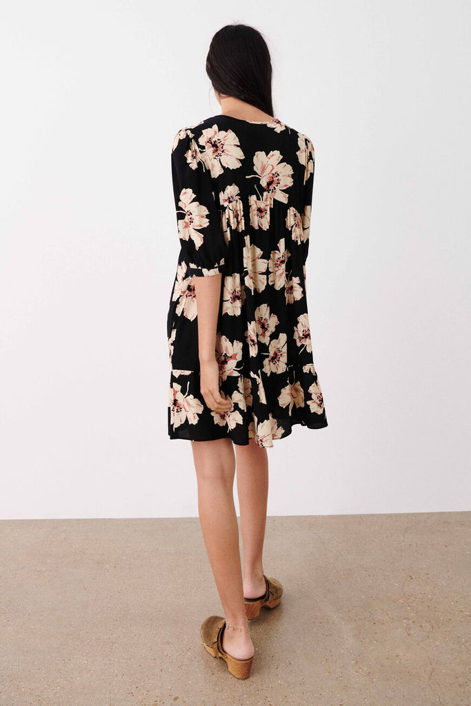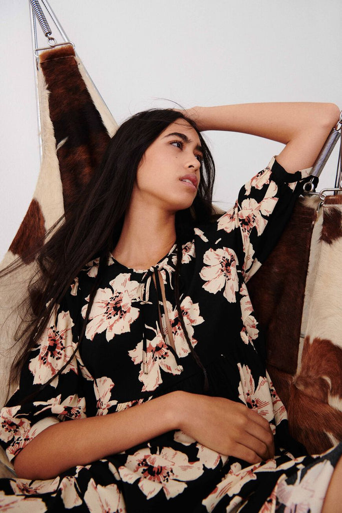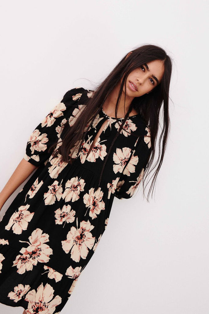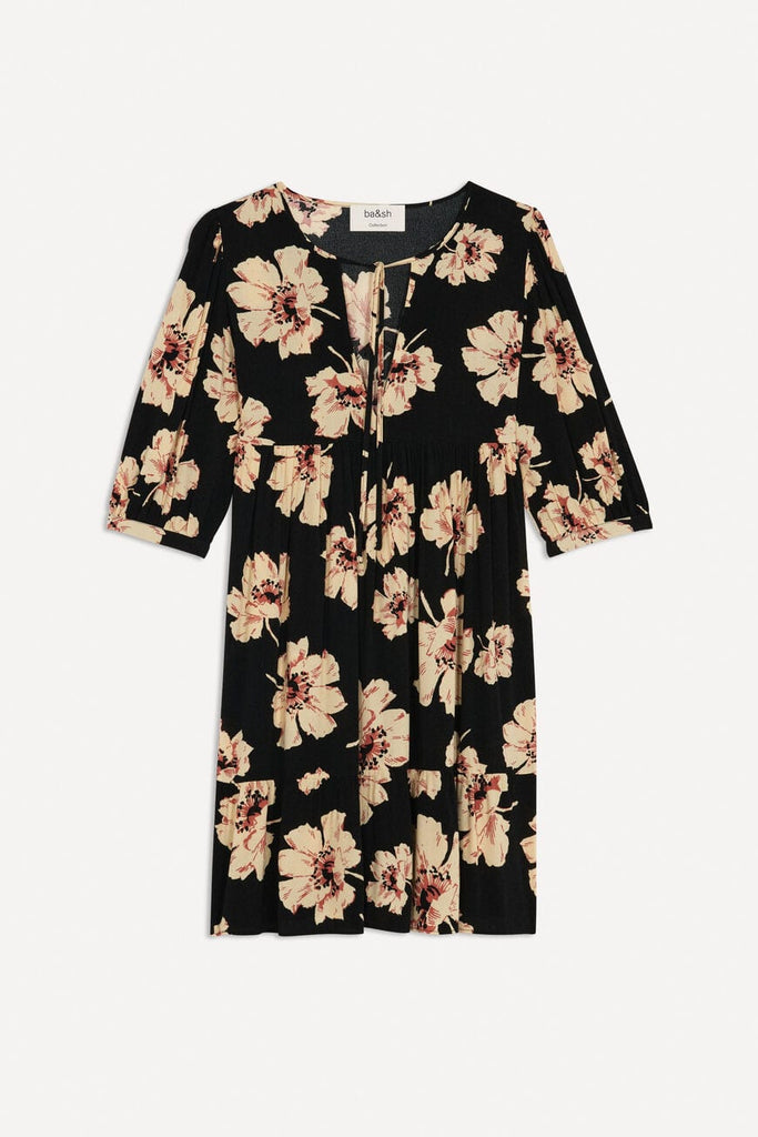 The Katia dress by Ba&sh is short, loose-fitting, features a round neck with a teardrop cut-out fastened with a tie and elbow-length sleeves. The upper panel gathers under the bust and has a flouncy frill at the bottom of the skirt. The flowing fabric holds a bold floral print that is perfect for this season.