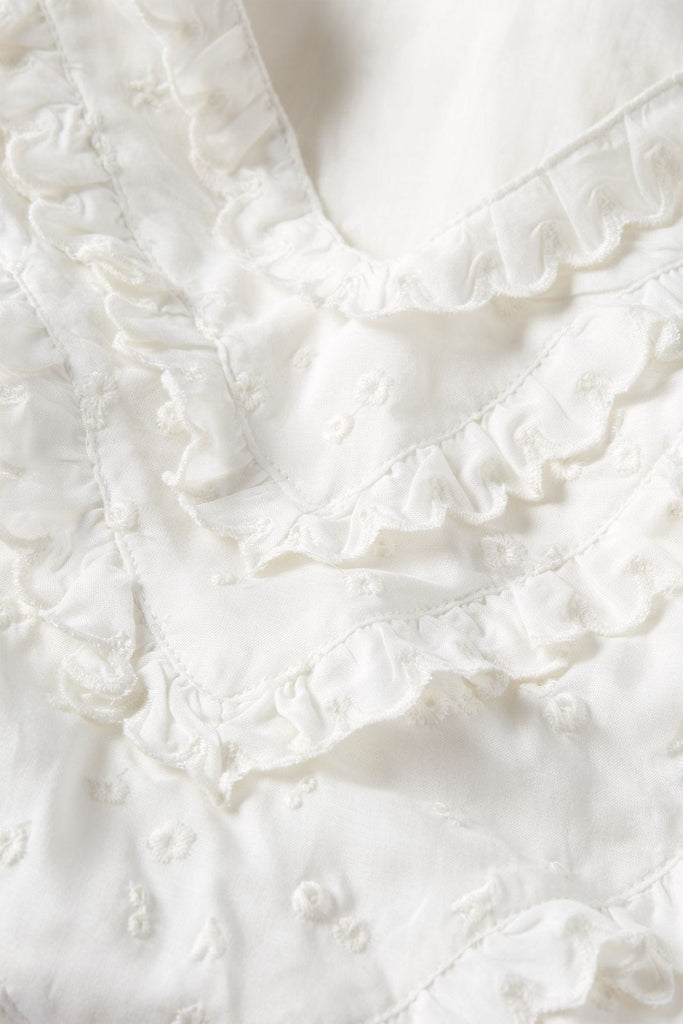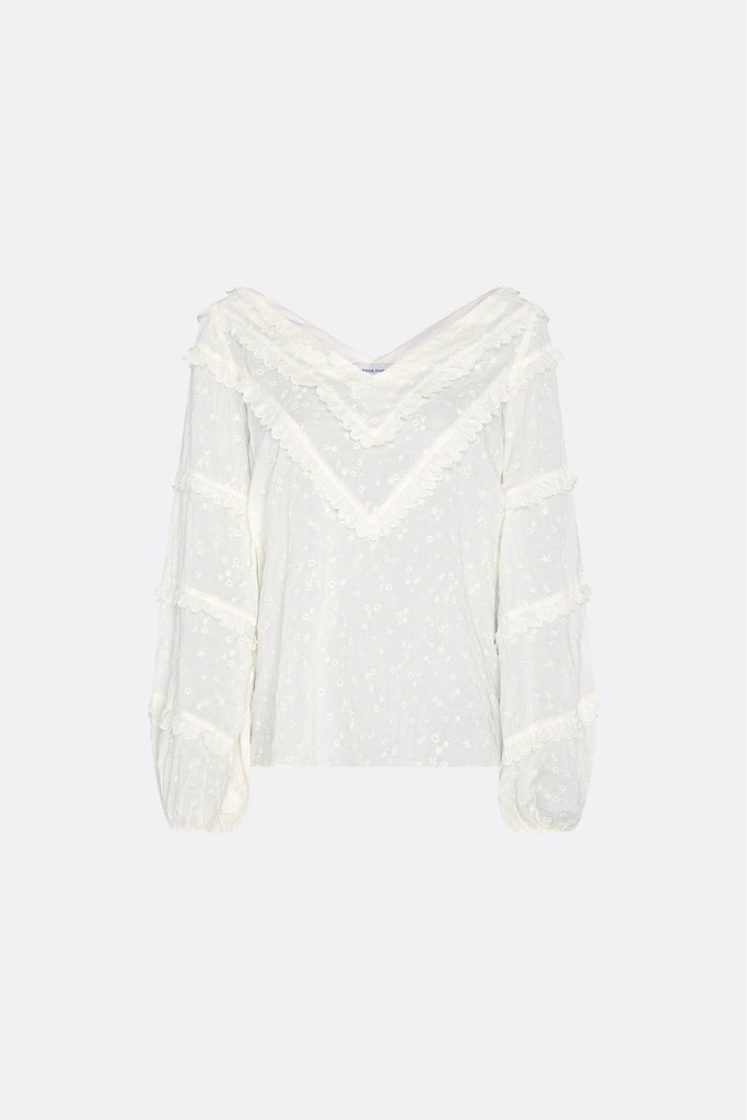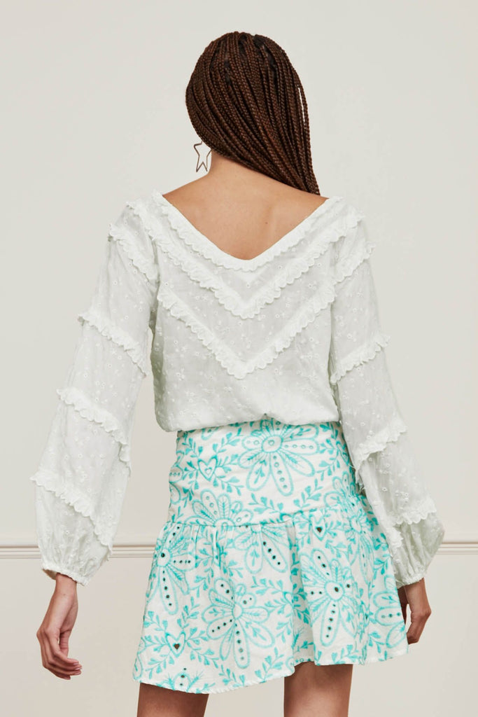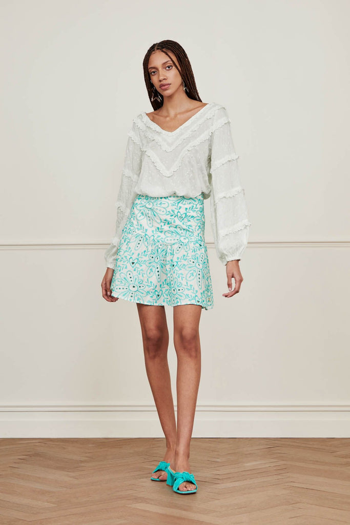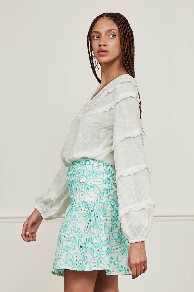 The pretty Coco top from Fabienne Chapot features dainty little embroidered flowers all over. In an easy to wear cream colour with a v at the front and back, puff sleeves with elastic at the wrist this is a perfect choice with your favourite denim.