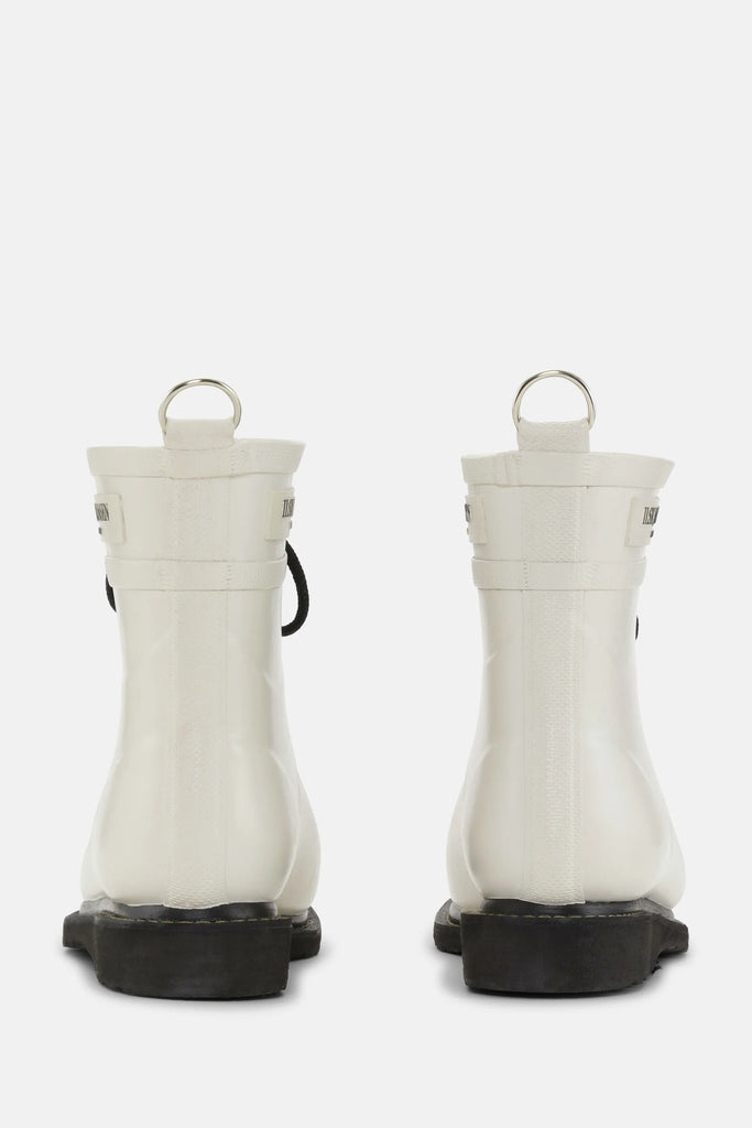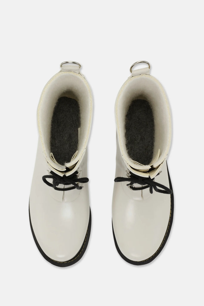 These fun short laced rubber boots in Kit, a milky white, by Ilse Jacobsen have a cosy fleecy lining and black laces. They look just as at home on a country walk as well as navigating those wet city days. They are made of sustainably harvested natural rubber and can withstand temperatures down to -20 degrees Celsius.