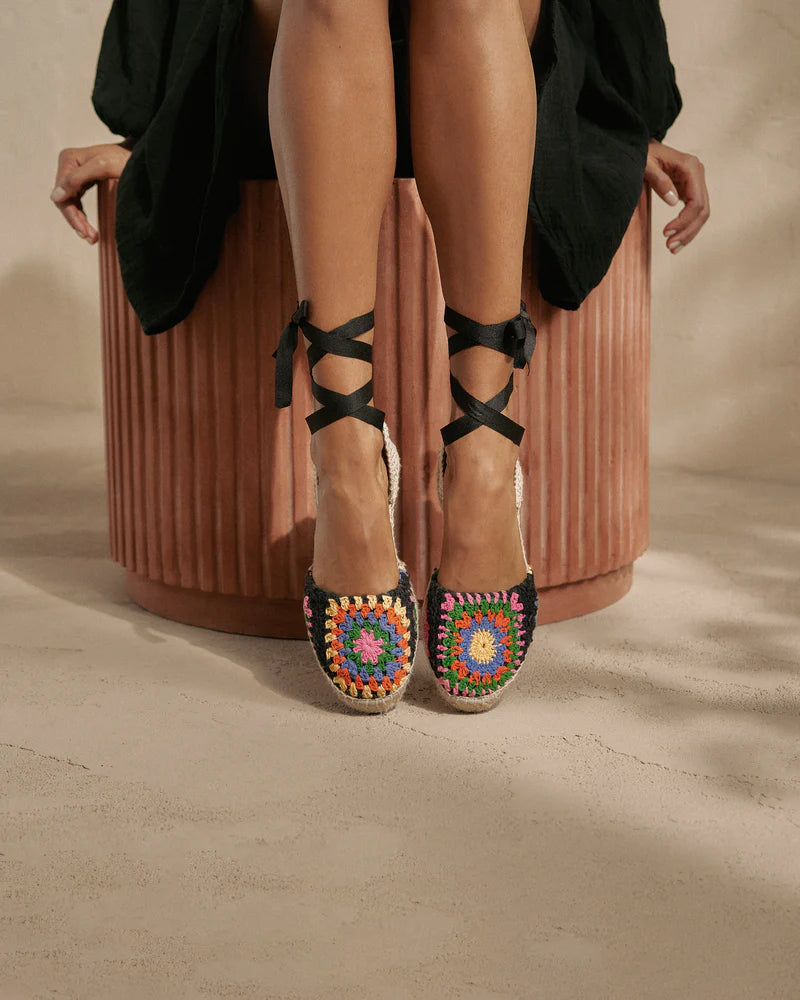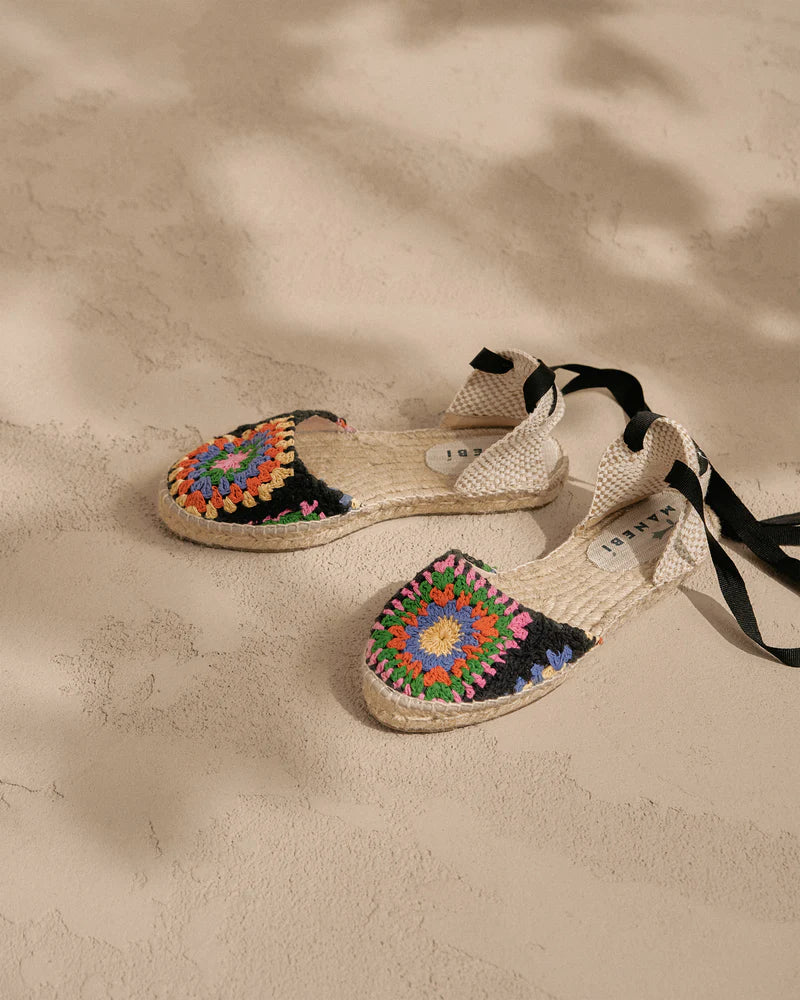 These flat Valenciana Espadrilles from Manebi are crafted in a colourful soft cotton crochet - perfect for pairing with almost everything! The crochet is placed slightly differently on each pair making yours unique. The tie up the leg also adds to their effortless silhouette.