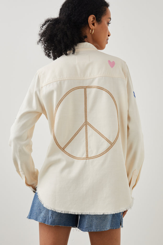 This vintage twill, long sleeve, button-down shirt jacket from Rails features embroidery motifs, flap pockets with button closure at the chest and a raw hem. This staple is easy to wear open with a tee for a laidback look or buttoned-up for classic styling. This season in a flattering ivory this is perfect paired with your favourite denim shorts.
