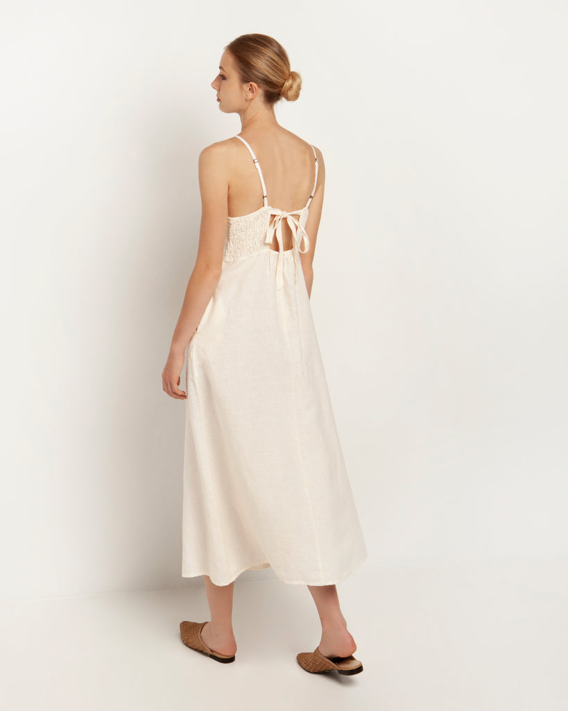 This beautiful daisy embroidered midi dress from Greek Archaic Kori features a halter-style neckline with a smocked keyhole tie back. It has adjustable straps and a slight A-line shape. Pair with your favourite espadrilles for an elegant summer look.