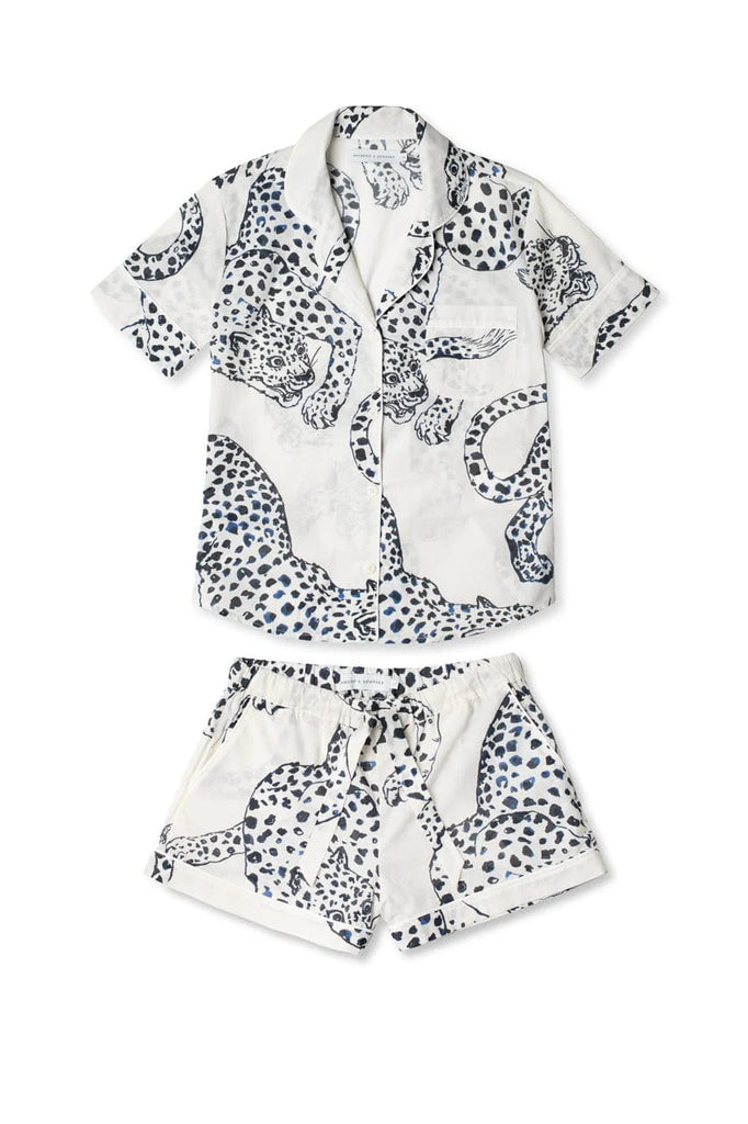 We are excited to be stocking super cool British pyjama brand Desmond & Dempsey. The Short Sleeve Pyjama Set consists of a tailored short sleeve shirt with a rounded collar and piping and matching tie-waisted shorts with pockets. It's crafted from extremely soft 100% Cotton Voile and comes in this gorgeous Jaguar print.