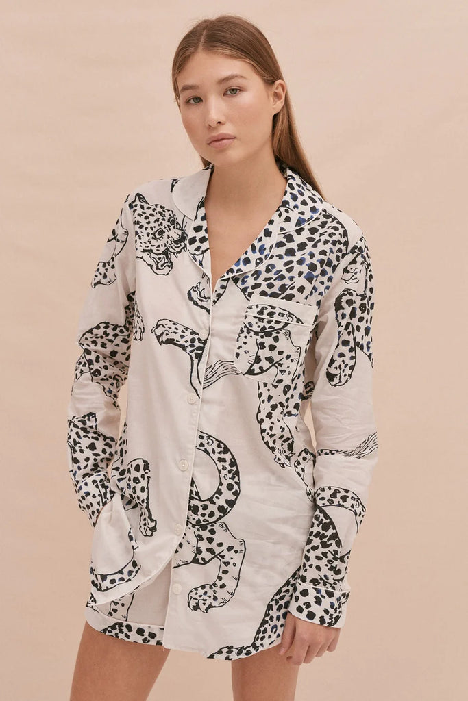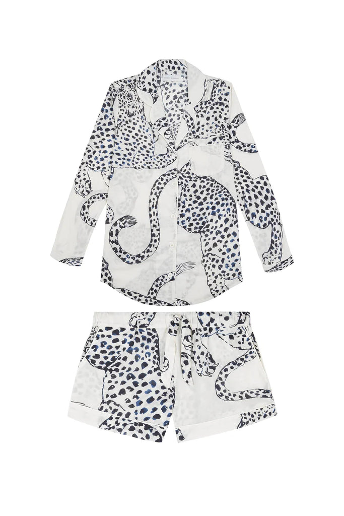 We are excited to be stocking super cool British pyjama brand Desmond & Dempsey. The Signature Pyjama Set consists of an oversized but tailored long sleeve shirt with a rounded collar and piping, and matching tie-waisted shorts with pockets. It's crafted from extremely soft 100% Cotton Voile and comes in this gorgeous Jaguar print.
