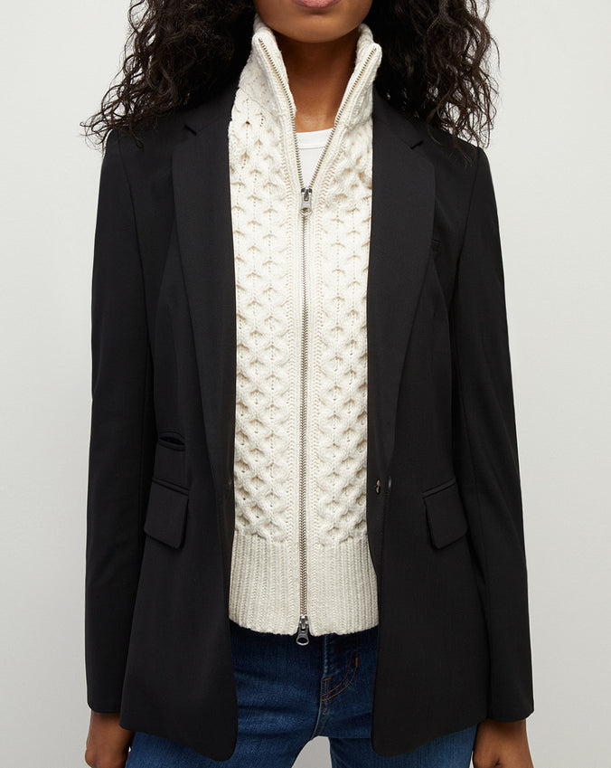 We are thrilled to be stocking Veronica Beard this season! What a perfect way to add a a bit of warmth to your favourite Veronica Beard jacket without adding too much bulk. Crafted from a super soft merino wool and featuring a rustic cable stitch and front zipper this is an excellent layering option.