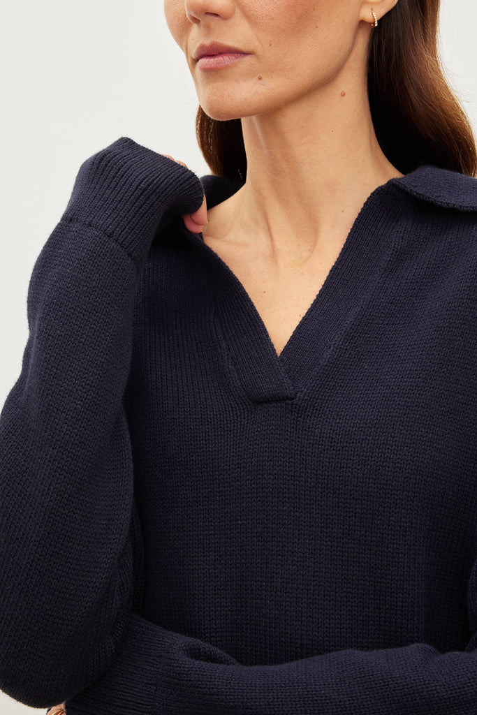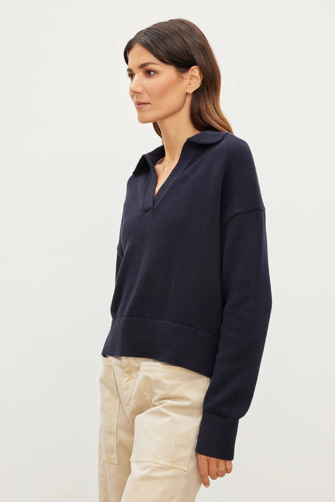The Lucie Jumper is a super soft cotton cashmere knit from Velvet by Graham & Spencer. In an easy to wear navy, this pullover features a preppy/sporty collar and long sleeves. This is perfect paired with your favourite skirt or denim!