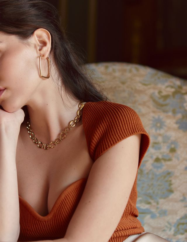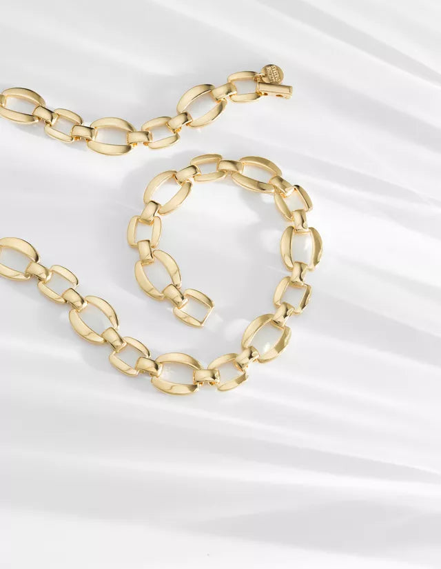 The Georgia chain necklace from Louise Damas is crafted from tin and is gilded with 24k fine gold. Featuring wide and dual vintage-inspired links, this choker can be worn alone or accompanied. It's invisible fastening system also melts into the chain's pattern.