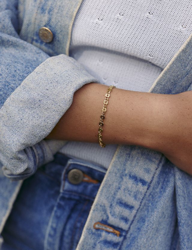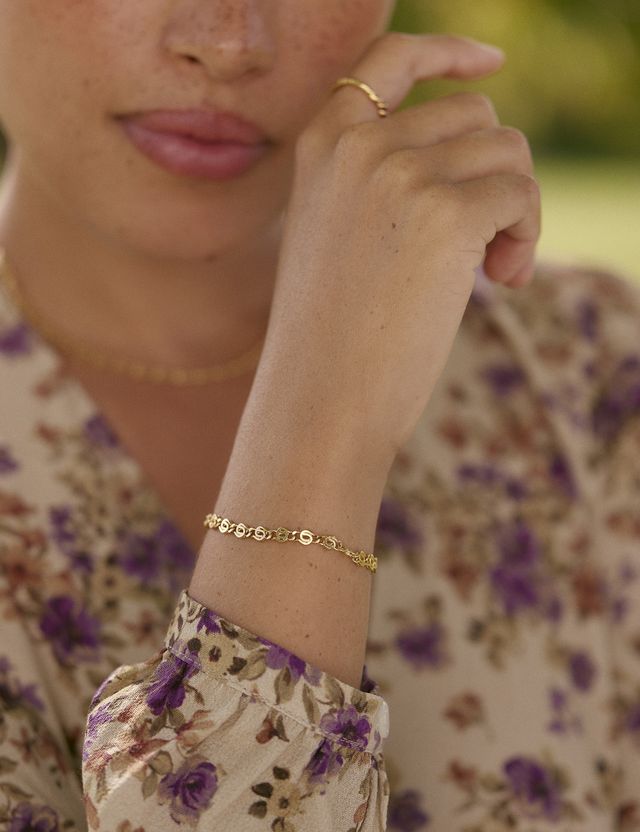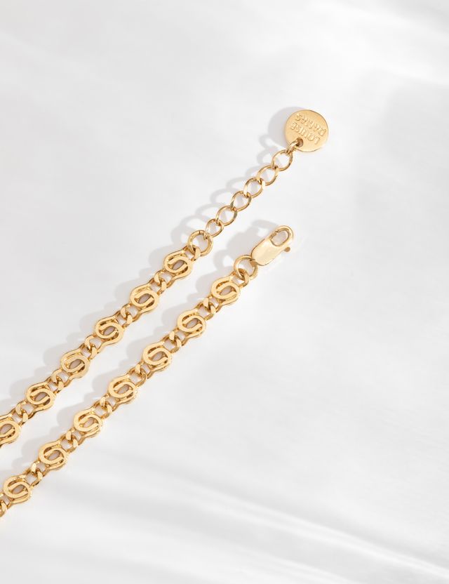 This is the perfect bracelet for layering or wearing on it's own. A sophisticated piece which represents a chain of small iris buds. Handcrafted in Louise Damas' Paris workshop this pretty bracelet is gilded in recycled 24k fine gold RJC certified onto brass. The chain is 15.5cm long and has a convenient 2cm adjustment bit.