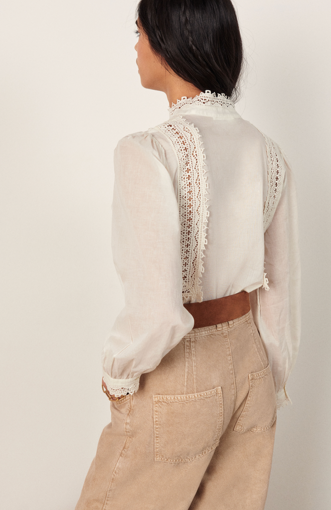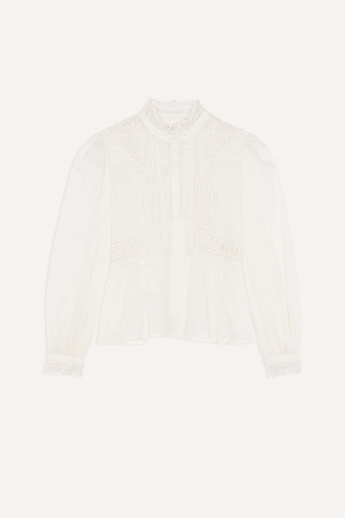 The ba&sh Selma Blouse abounds with romantic elegance. This blouse has a standing collar, a concealed button placket and long sleeves with gathered shoulders. It is very comfortable in floaty, lightweight cotton voile.