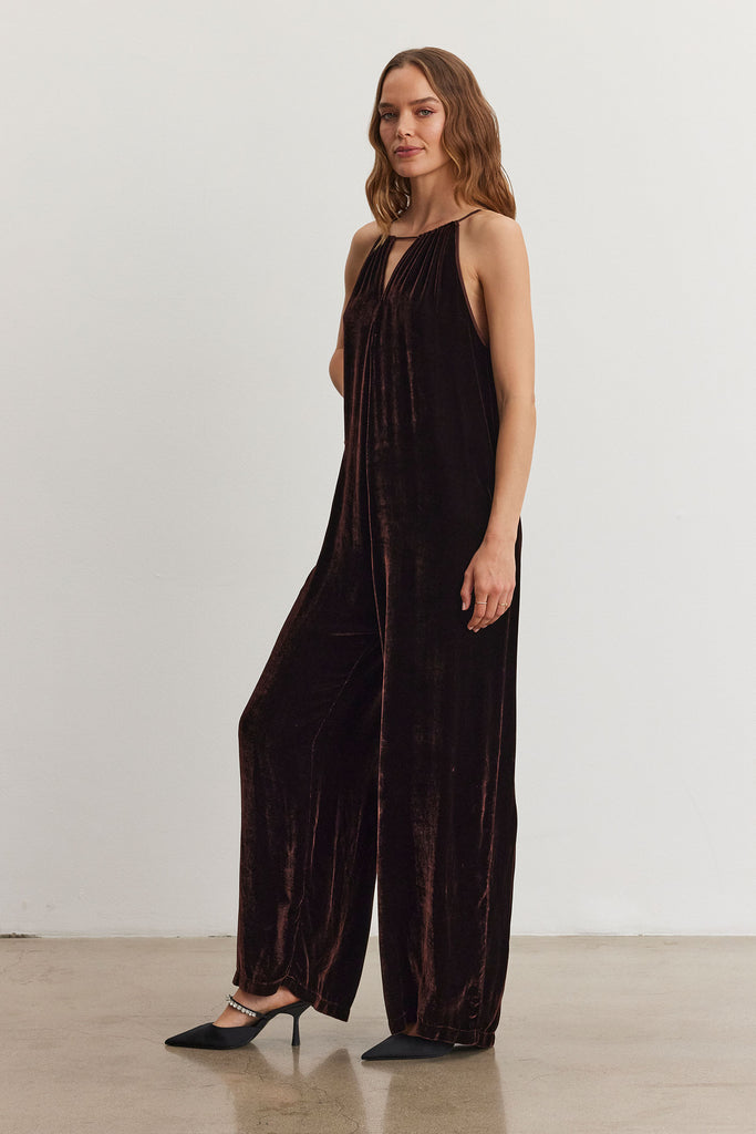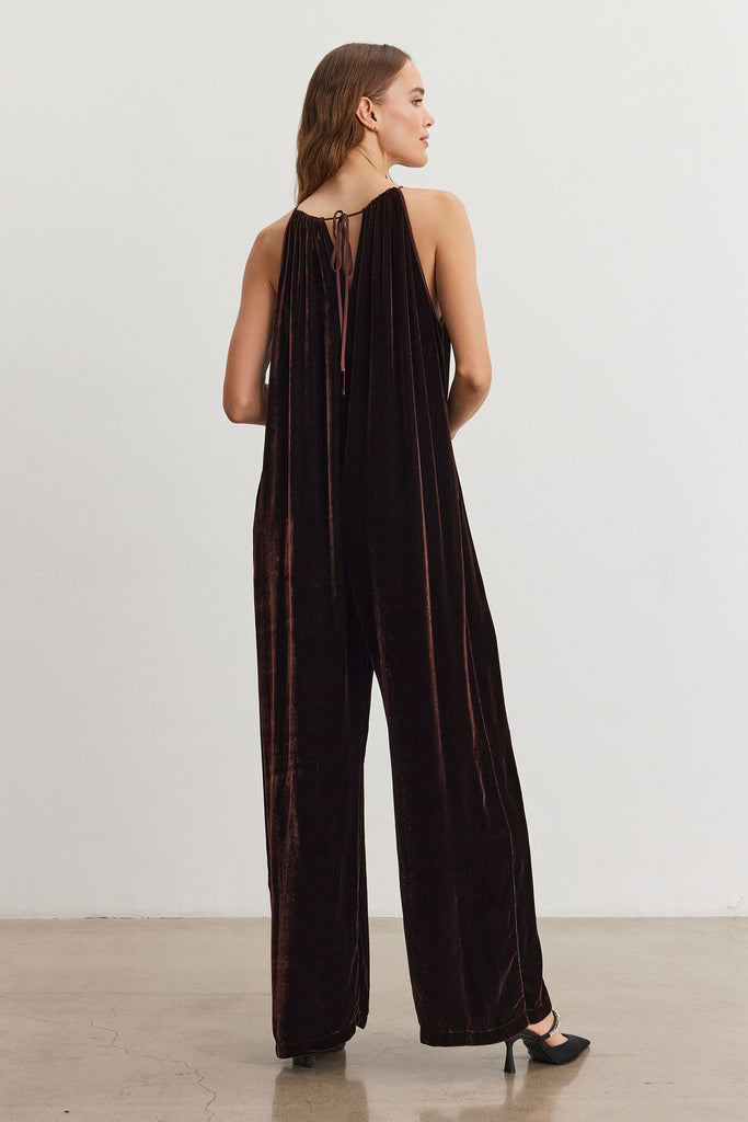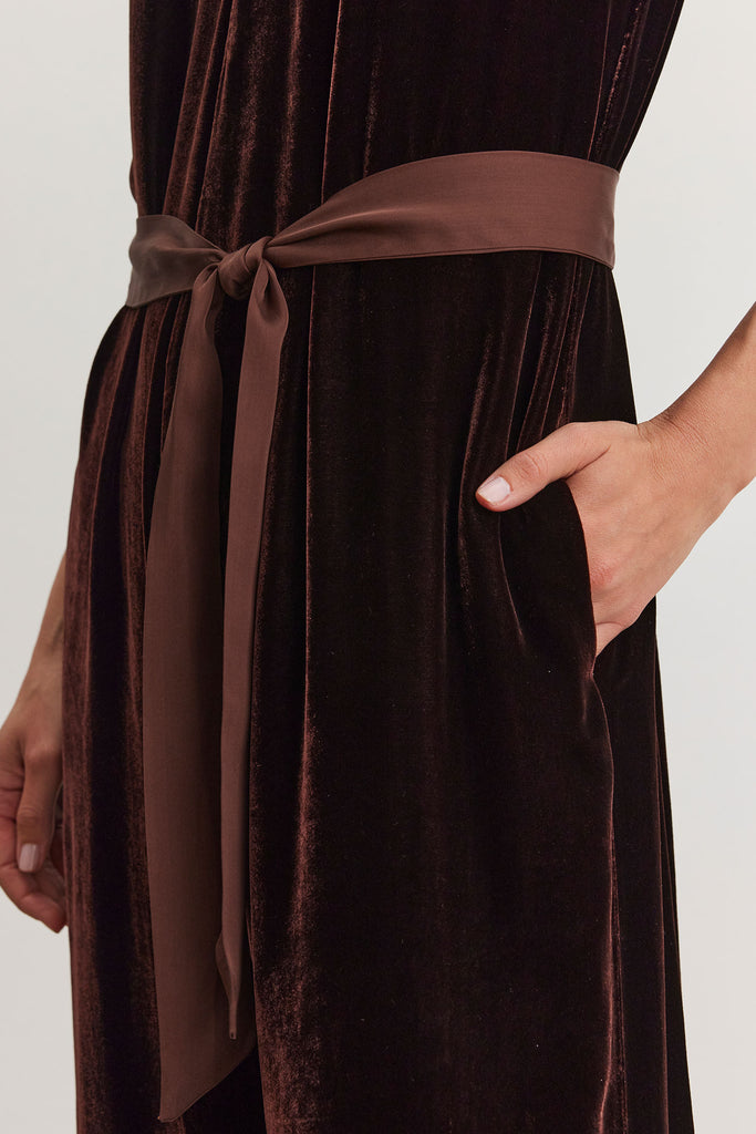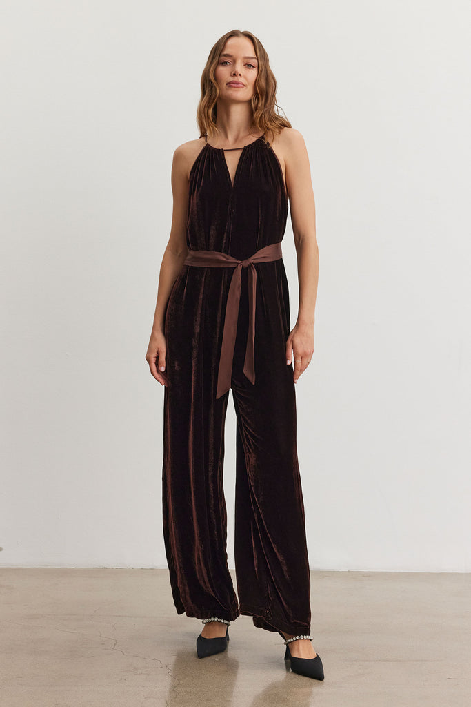 Jumpsuit of dreams! Crafted from super soft velvet in the most beautiful browny bronzy colour and featuring wide legs, a thick satin self tie belt and self tie at the neck this will easily see you thru the party season in style. Love it!