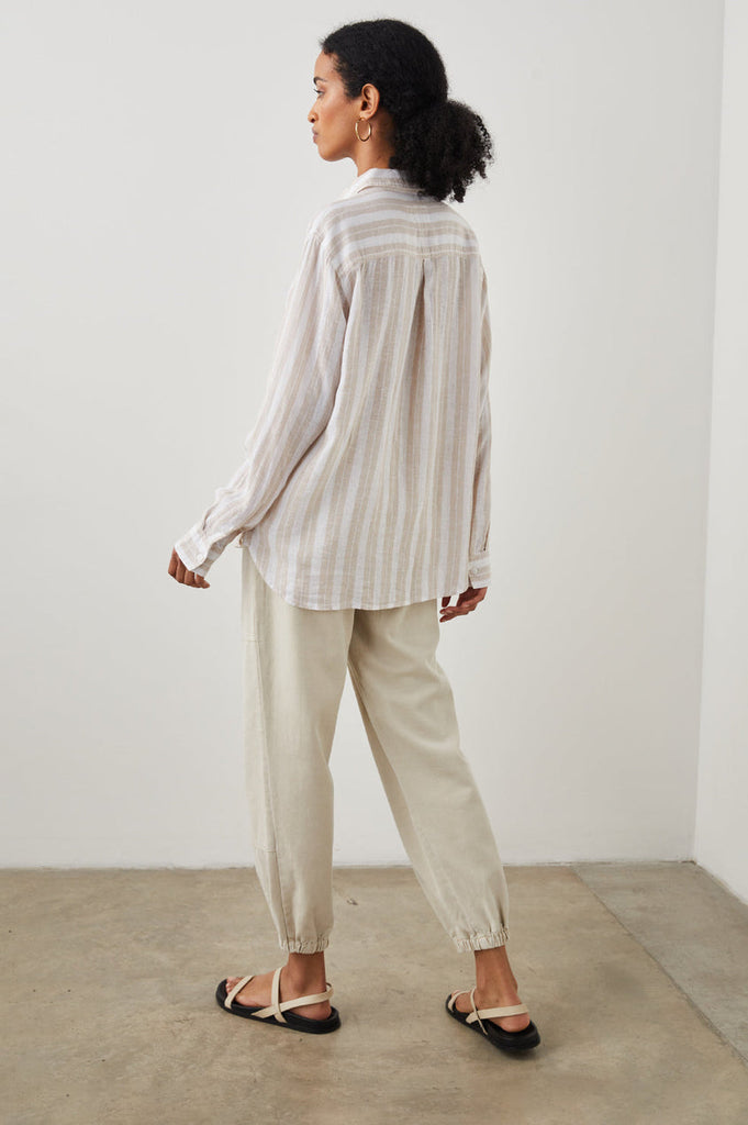 Striped, long sleeve button-down top with high-low shirt tail hem, and single chest pocket. Lightweight, breezy linen fabric mixed with a relaxed body shape makes the Charli the perfect Southern California inspired button-down. Looks fab paired with your favourite denim.