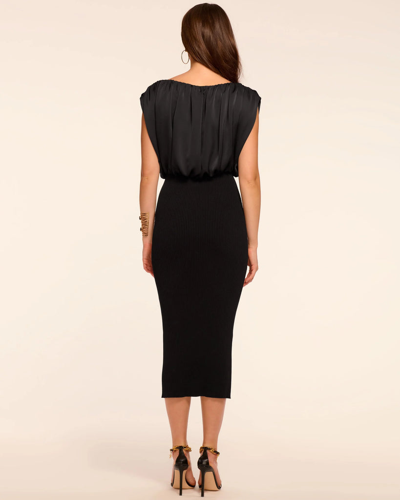 Get ready for the compliments! The Rochelle dress from uber cool New York City brand Ramy Brook features a ruched satin bodice and a ribbed knit skirt blending the two different fabrics effortlessly. The combination makes this a super universally wearable dress - perfect for day or evening wear.