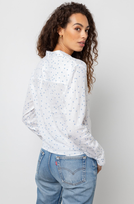 Pretty lightweight linen, long sleeve top from Rails in a dreamy star print! This is an easy to wear top with a fun tie up twist at the waist that will look great with your denim.