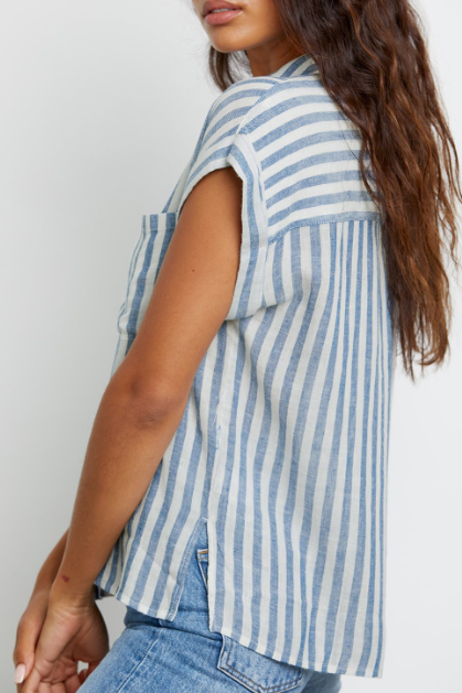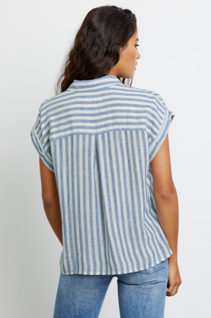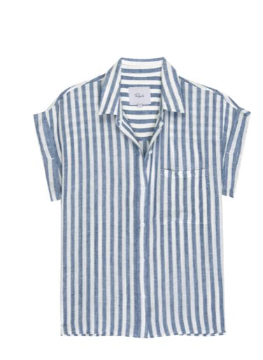 Can one ever have enough lightweight linen tops in the Summer?! This pretty short sleeved button down top from our go to casual brand Rails features a longer hem in the back and a relaxed flattering shape. This season Rails has done it in a preppy light blue stripe - perfect with white denim.