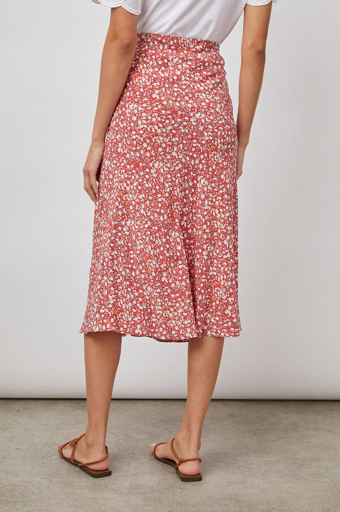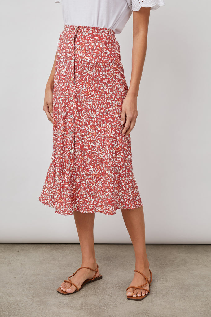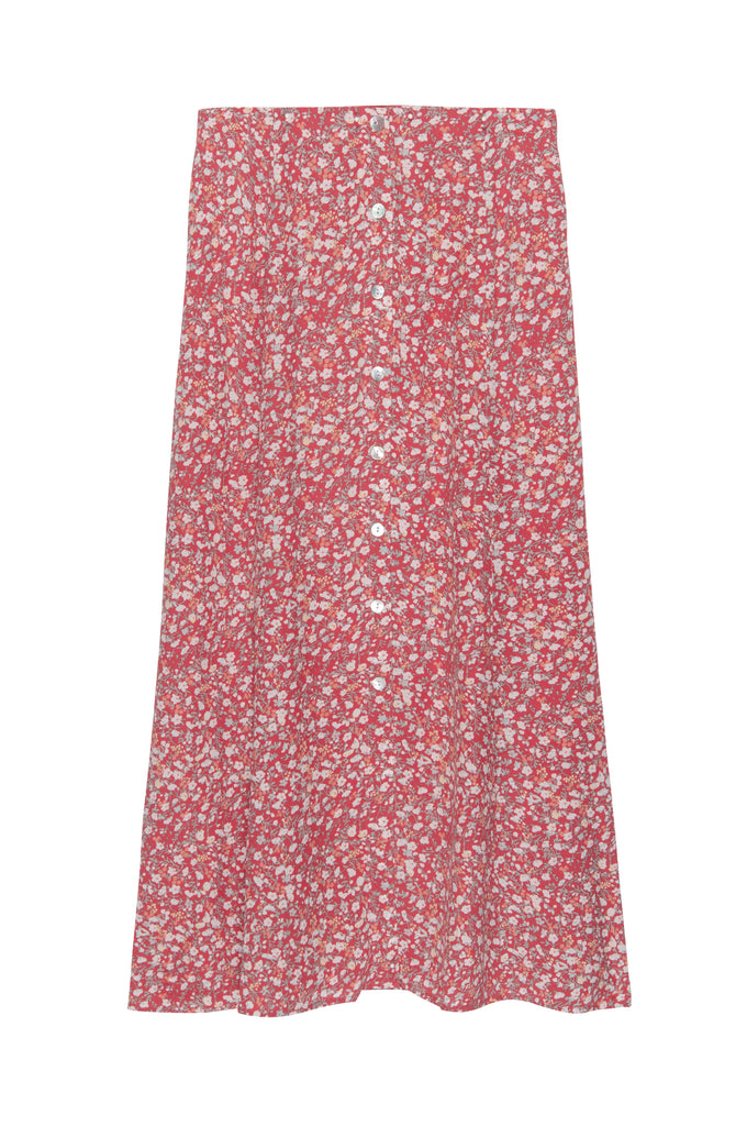 This is a great dress up or dress down skirt! Crafted from lightweight rayon crepe Rosetta features a flattering bias cut, midi length, natural shell buttons at centre front and comes in a pretty red floral print. Pair with a pretty cami and heels for evening or a white tee and trainers for a relaxed day look.