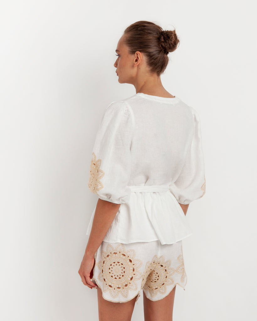 This pretty linen blouse from Greek Archaic Kori features a half-button v-neck and striking embroidery on the balloon sleeves. It can be worn with the belt or left loose. Pair with your favourite denim or shorts and a pair of sandals or flip-flops for a lovely summer look.