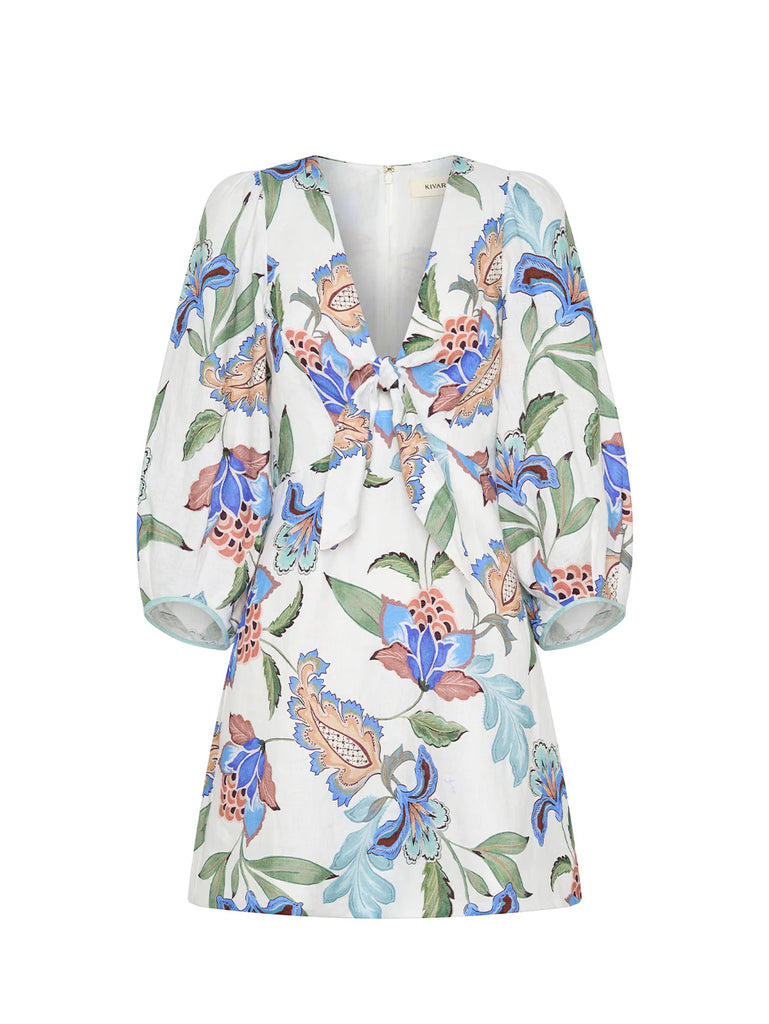 This gorgeous little mini dress is crafted from a beautiful European flax linen in a bold print featuring striking blue blossoms, terracotta accents and green leaves on a lovely crisp white base. Featuring a flattering v neckline, tie-front bodice and long sleeves pair with heels for an elevated evening look or flat sandals for an easy day option.