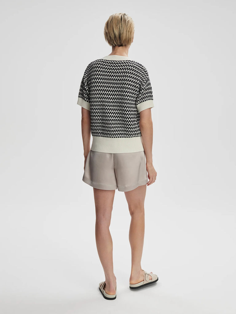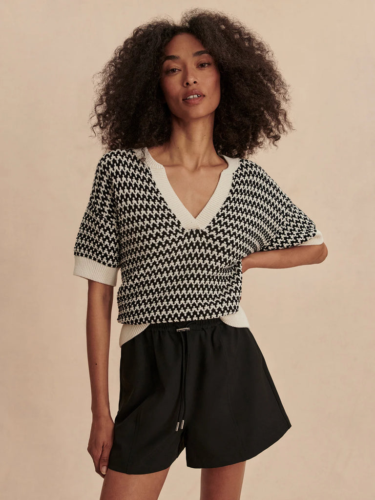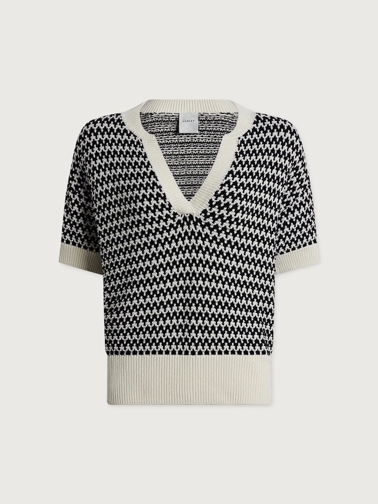 The Dora knit top from Varley has a relaxed fit with a drop shoulder and deep V-neckline that takes inspiration from a classic Polo collar. Made from 100% cotton with a textured two-colour stitch.