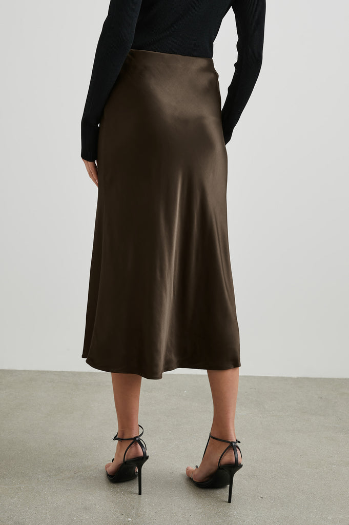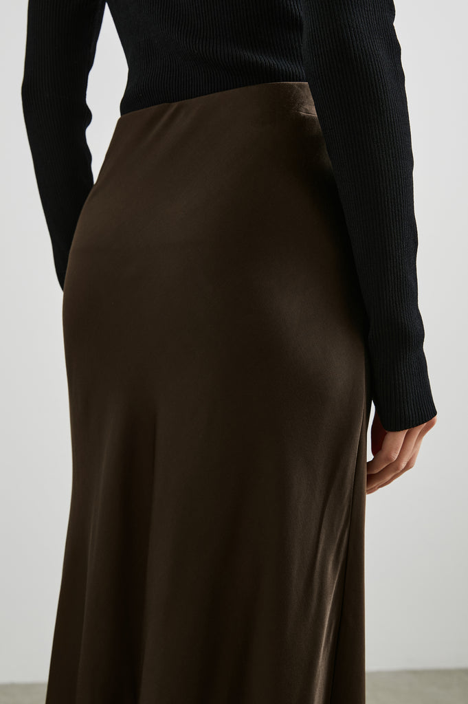 Anya is a super silky satin crepe midi skirt, featuring a concealed elasticated waistband and an extremely flattering bias cut. In a rich luxurious looking chocolate this looks fab paired with a bit chunky knit or dress it up with a little silky top for an evening look!